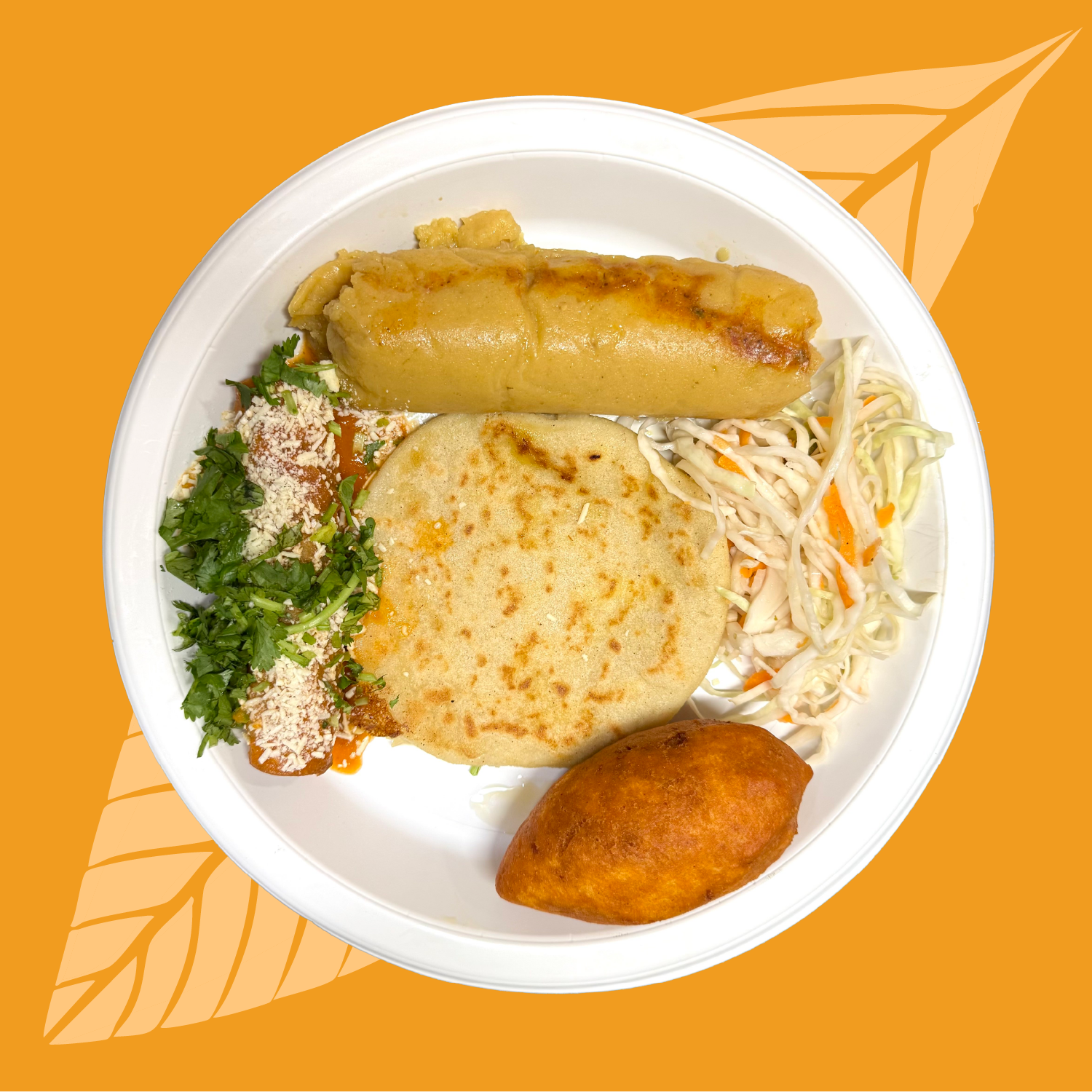 a delightful combination plate featuring one tamale, one pupusa, one pastelito, and one crispy fried taquito.