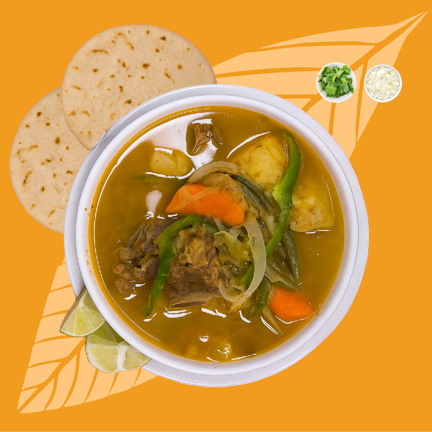 a hearty beef soup featuring tender chunks of slow-cooked beef, a medley of fresh vegetables, & a rich, savory broth. served with your choice of white rice or 2 tortillas.